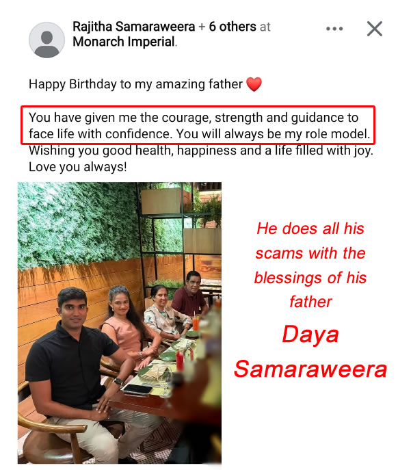 He does all his scams with the blessings of his father Daya Samaraweera
